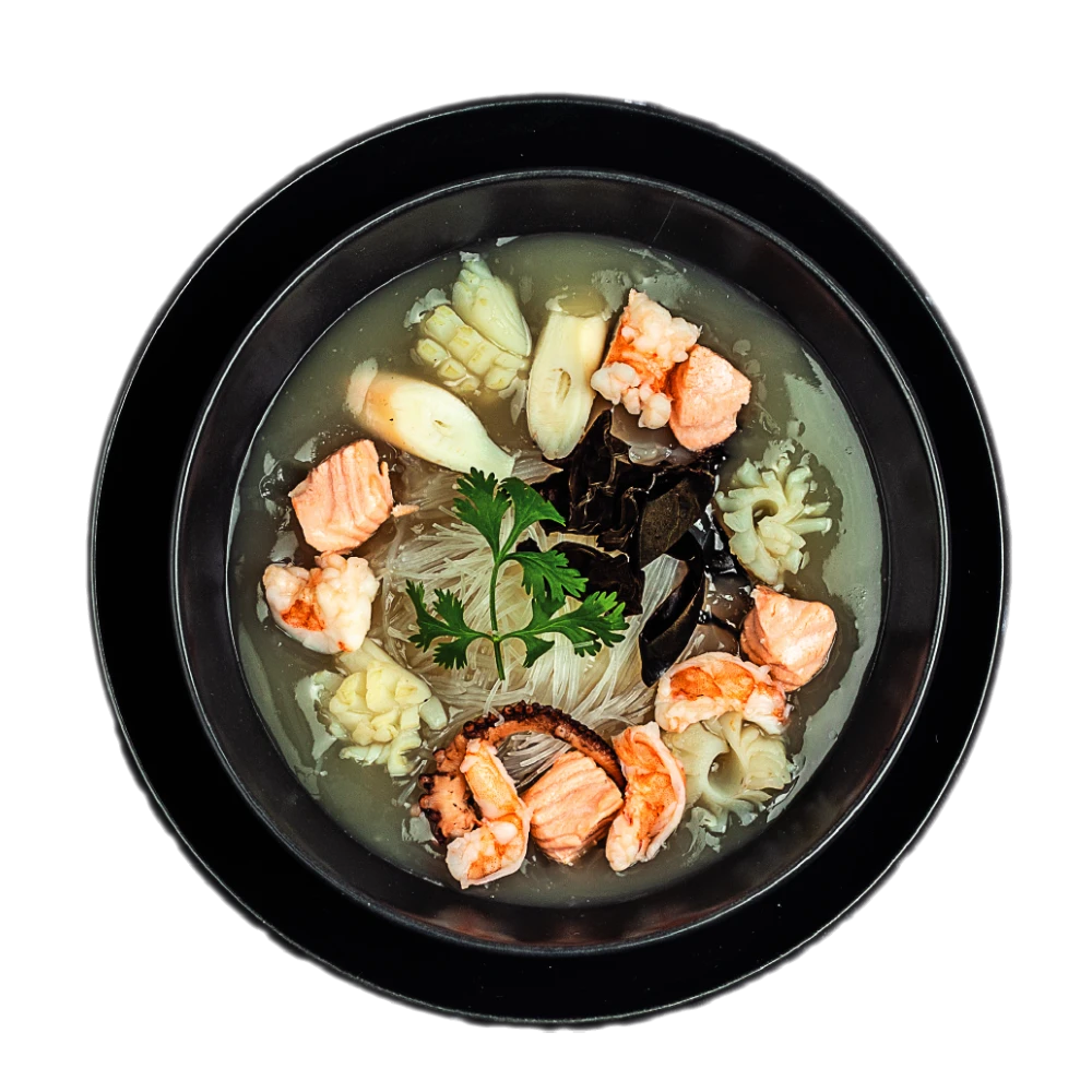 Crevette, calamar, saumon, surimi, champignons noirs, vermicelle, ciboulette