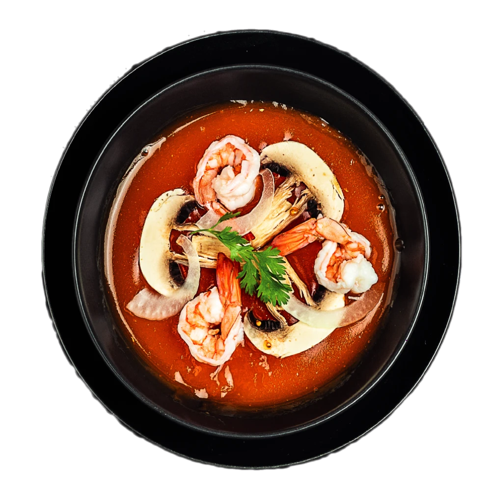 Crevettes, Pate Tom yum, champignons frais, tomate cerise, lait, coriandre