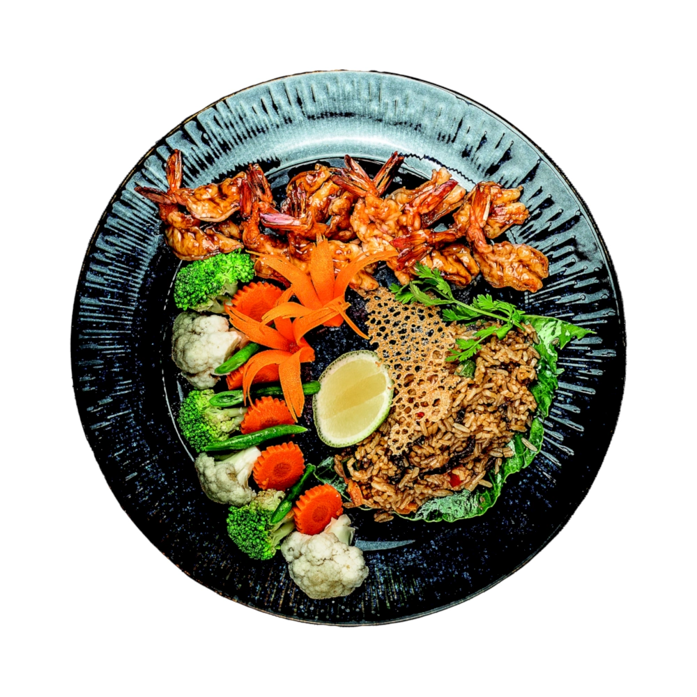 Black tiger, brocoli, choux fleur, carotte, haricot vert, riz cantonais, japan sauce