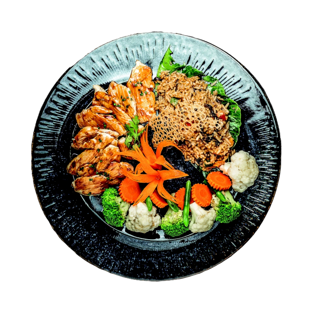 Poulet, brocoli, choux fleur, carotte, haricot vert, riz cantonais, japan sauce