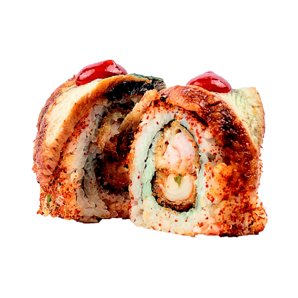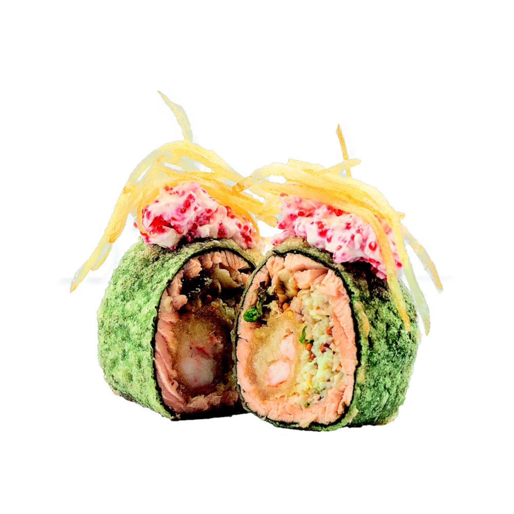 Saumon cuit mariné, crevette panée, anguille, crabe Crème cheese, Tobiko