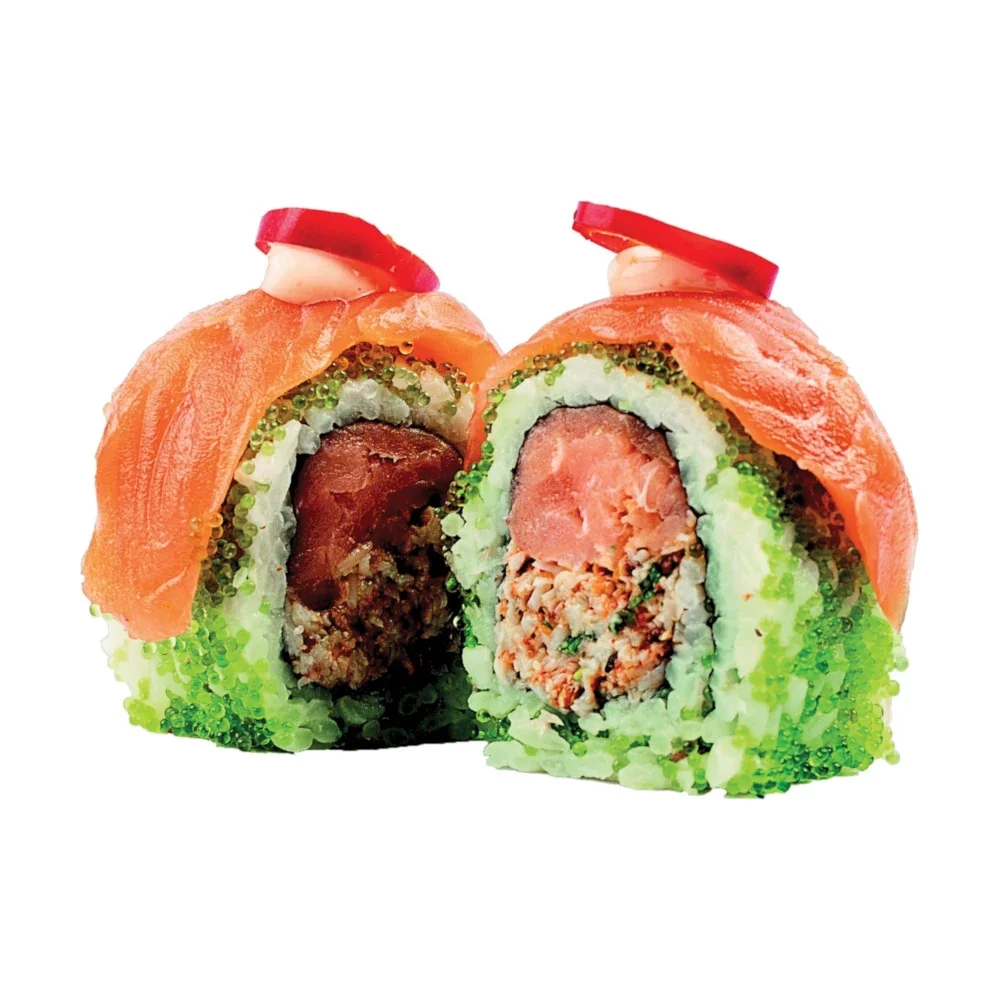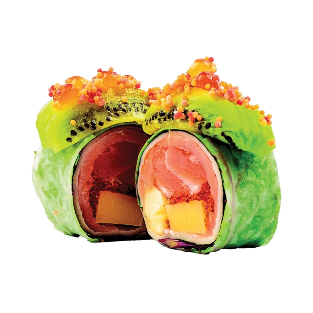 Crevette pochée, Crabe mariné, kiwi, Saumon, ikura Crème cheese, tobiko