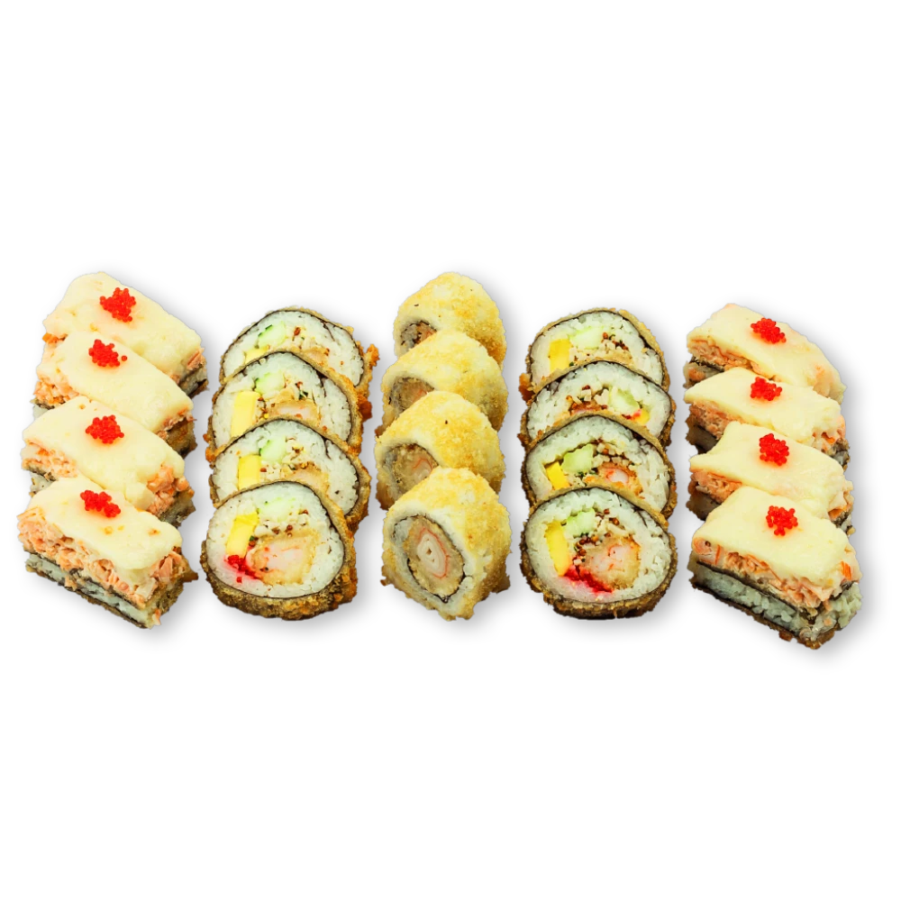 4 crispy maki surimi, 4 crispy maki saumon, 8 sushi pizza saumon avocat, 4 new delhi
